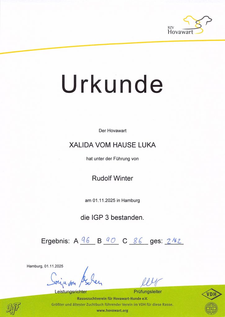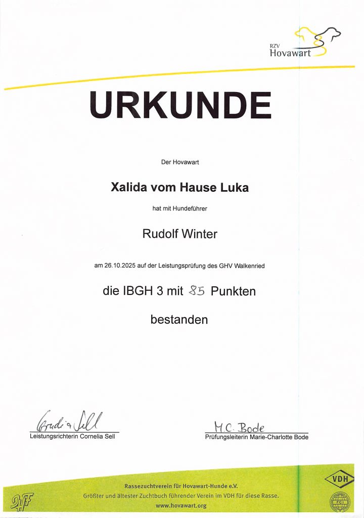 Am 26.10.2025 hat Xalida ihre FCI-IBGH 3 mit 85 Punkten erfolgreich bestanden.