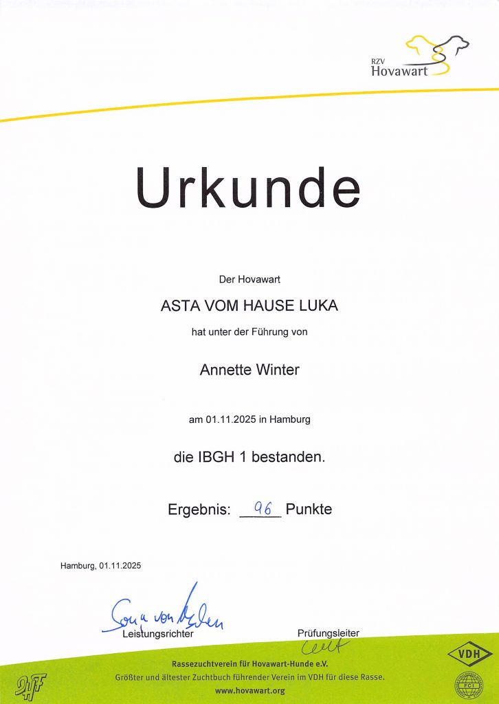 Am 01.11.2025 hat Asta mit Annette in Hamburg eine hervorragende IBGH 1-Prüfung absolviert. Das intensive Training der beiden wurde mit 96 Punkten / Vorzüglich belohnt.
